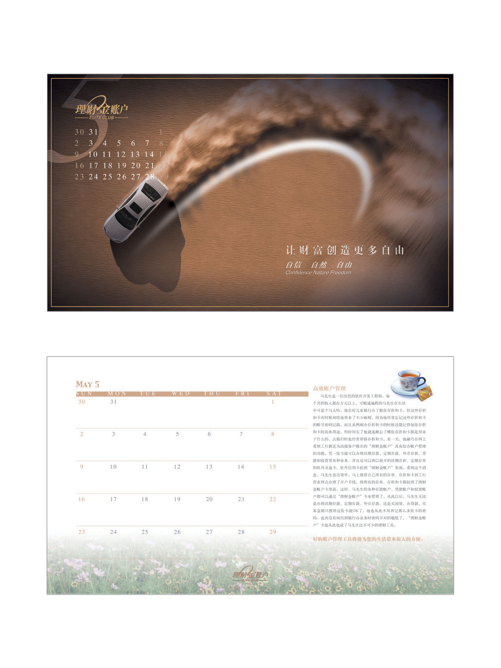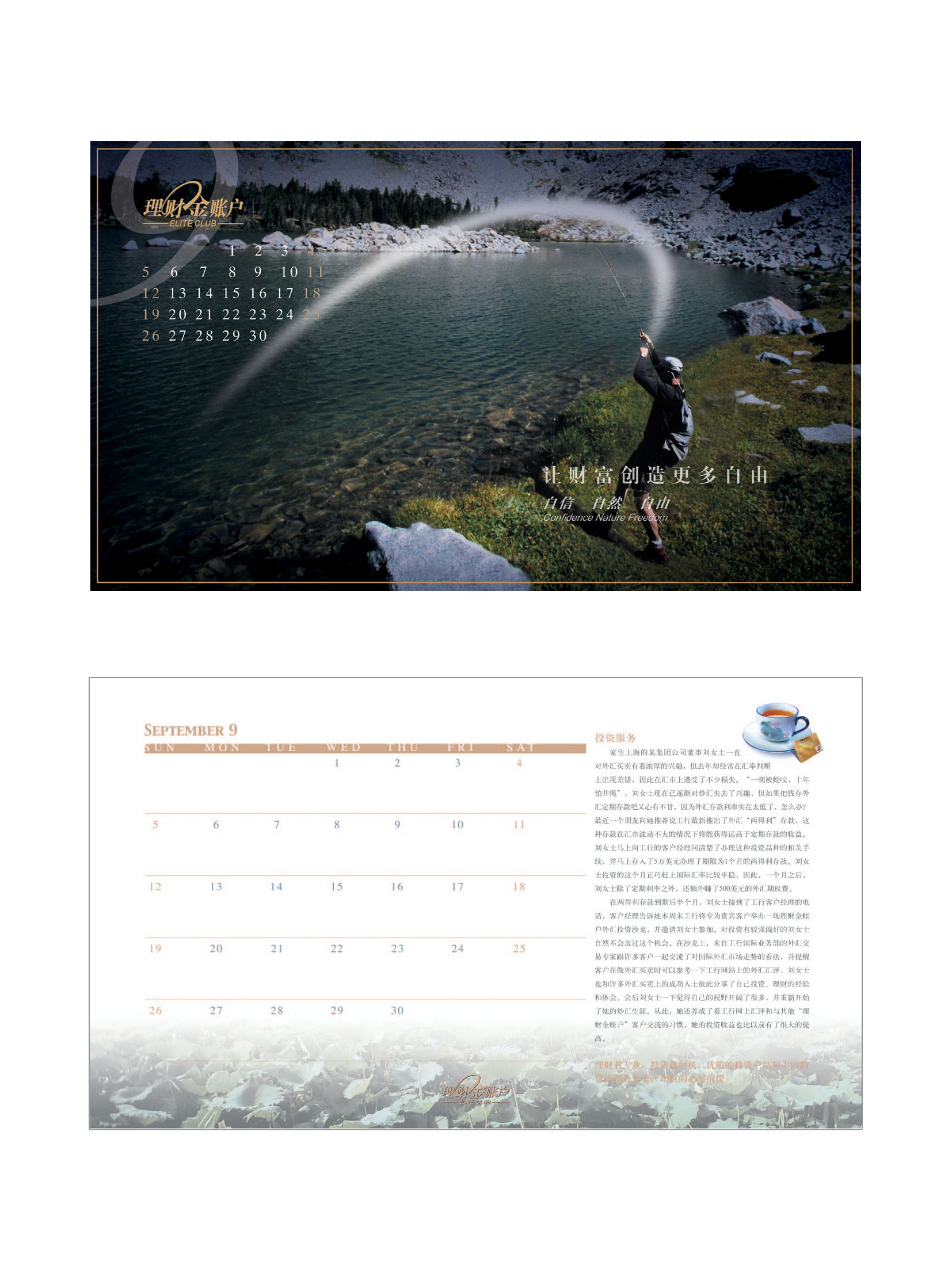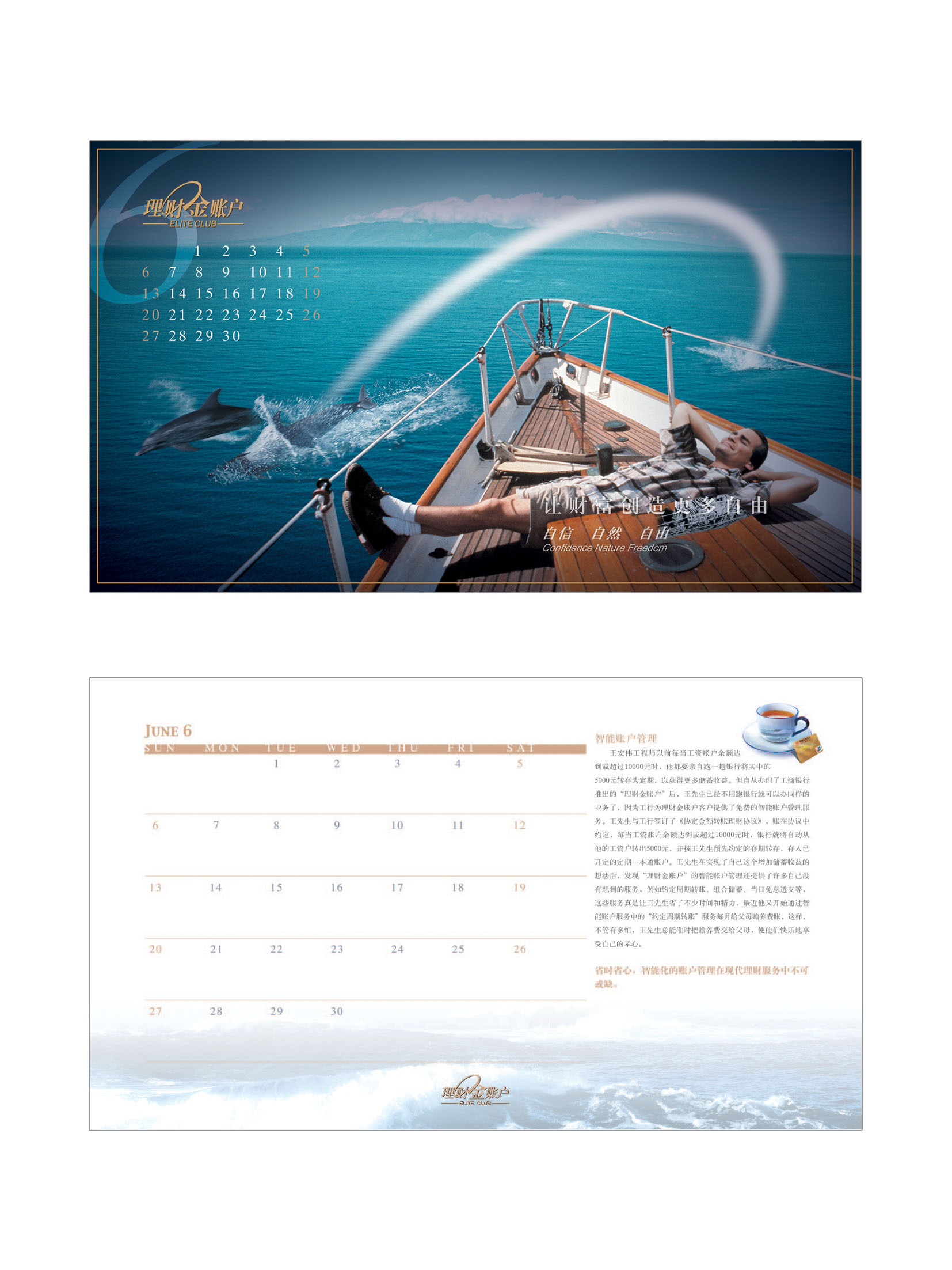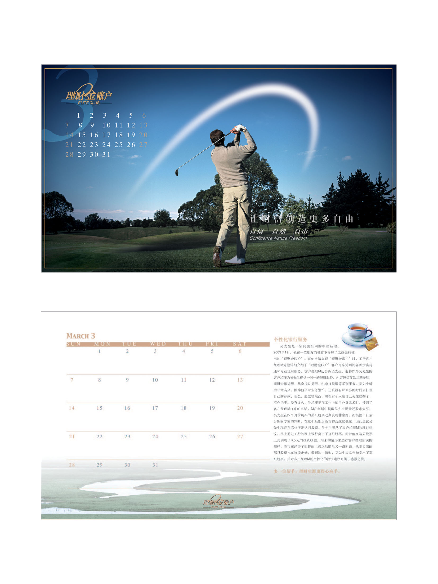 理财金账户2004年台历通过讲述12个现实生活中普通人的理财体验,深入浅出的介绍了理财金账户能为您带来的“绿色通道优先服务”、“贵宾专享优惠”、“个性化银行服务”、“特约商户优惠”、“高效账户管理”、“智能账户管理”、“对账单服务”、“理财规划”、“投资服务”、“环球理财服务”、“融资贷款服务”、“电子银行理财”等一系列专属服务,帮助您更加灵活自如的应用理财金账户的诸多功能,享受财富带来的更多自由!