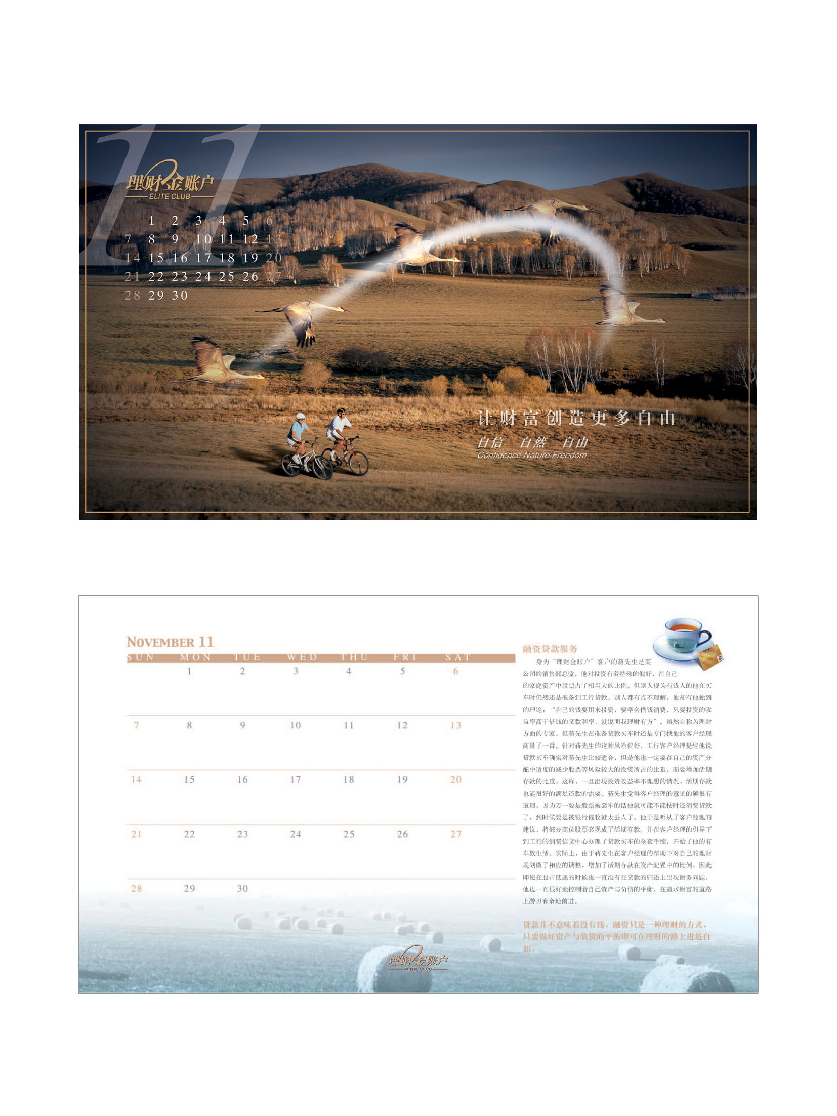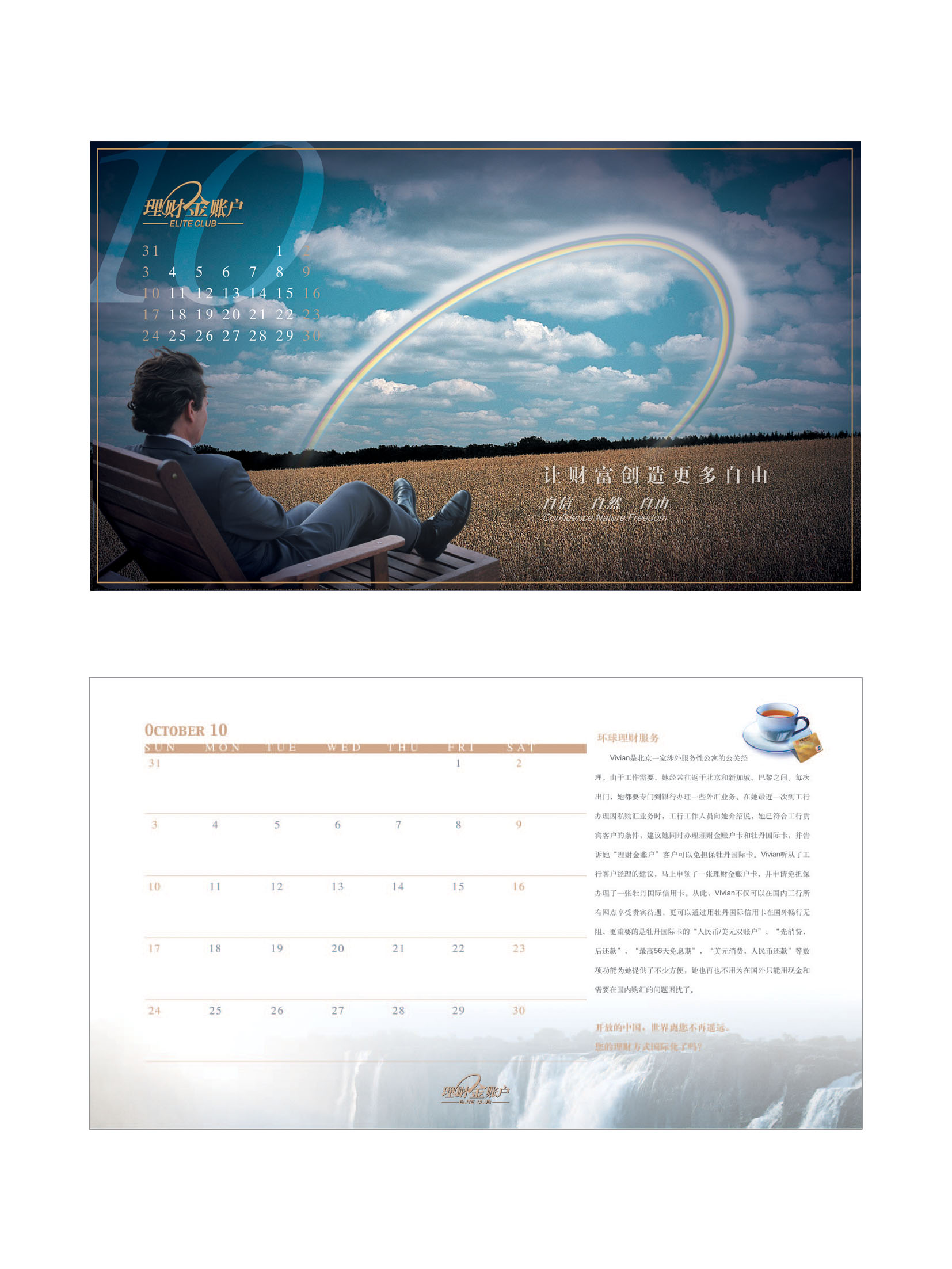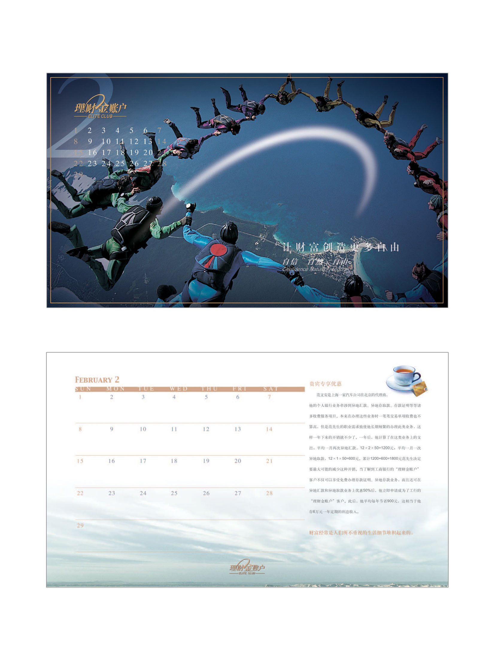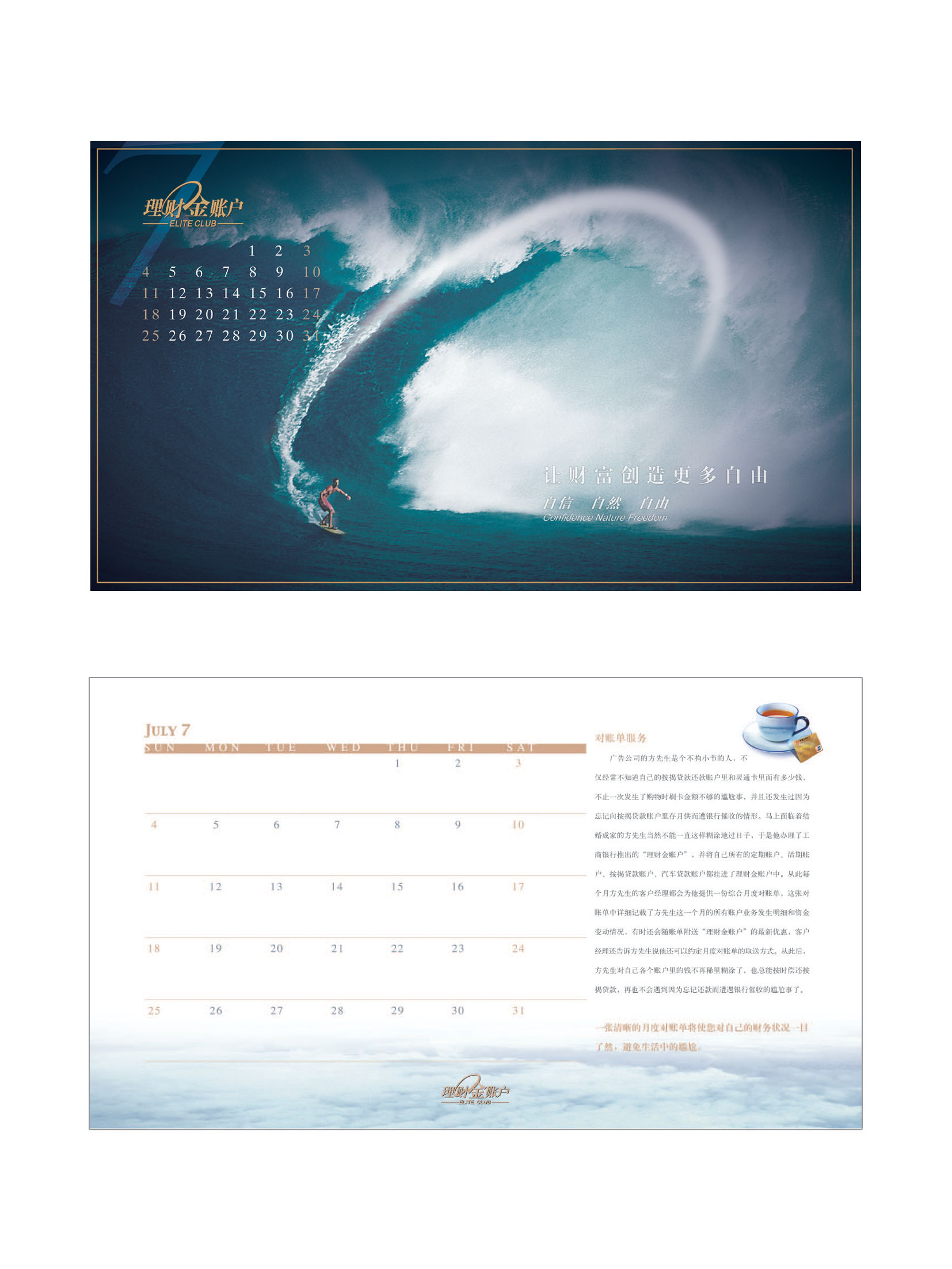 理财金账户2004年台历通过讲述12个现实生活中普通人的理财体验,深入浅出的介绍了理财金账户能为您带来的“绿色通道优先服务”、“贵宾专享优惠”、“个性化银行服务”、“特约商户优惠”、“高效账户管理”、“智能账户管理”、“对账单服务”、“理财规划”、“投资服务”、“环球理财服务”、“融资贷款服务”、“电子银行理财”等一系列专属服务,帮助您更加灵活自如的应用理财金账户的诸多功能,享受财富带来的更多自由!